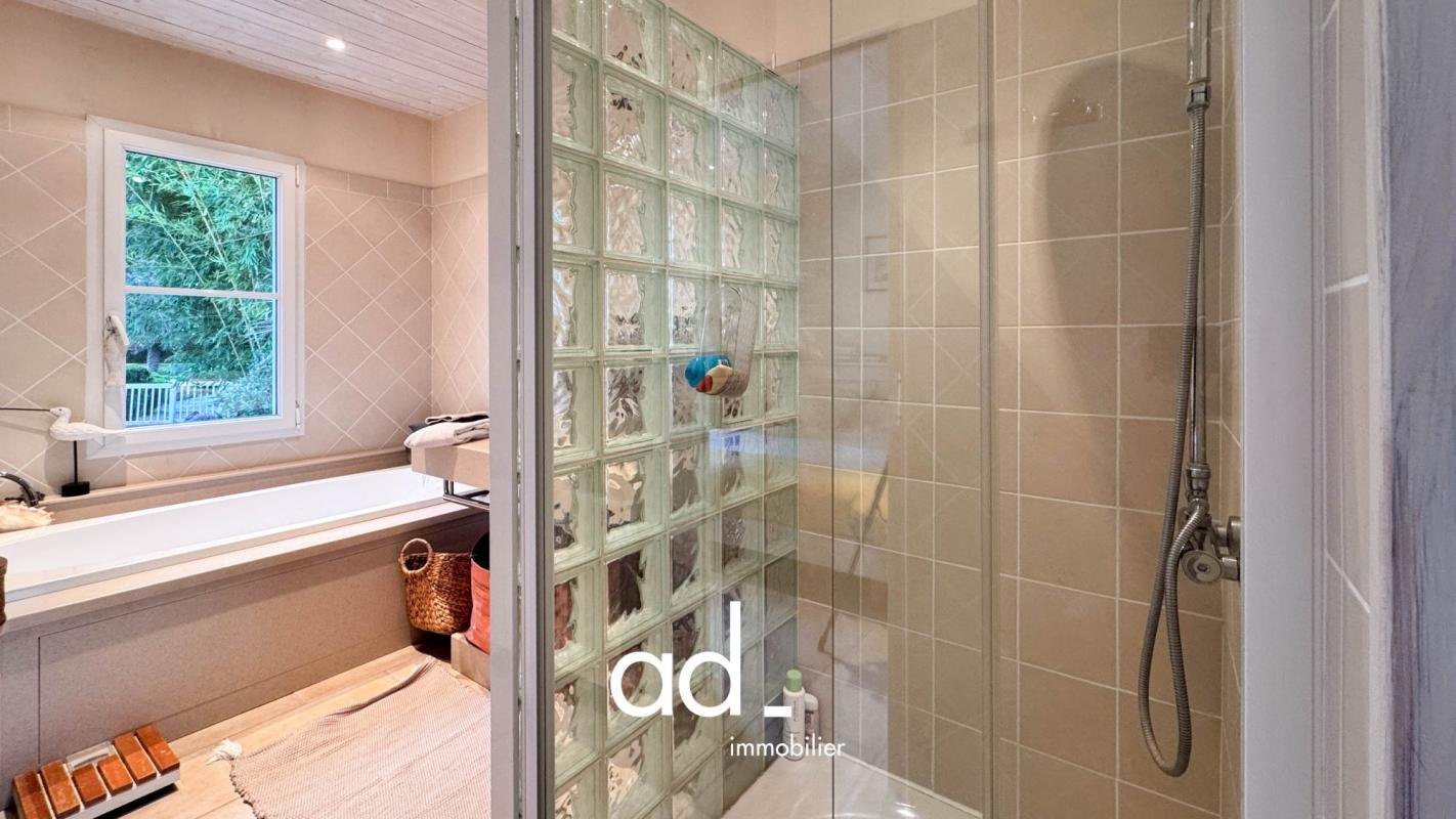 Le rez-de-chaussée propose également une suite parentale avec salle de bains et douche, offrant une vue apaisante sur la verdure, ainsi qu’une buanderie fonctionnelle.