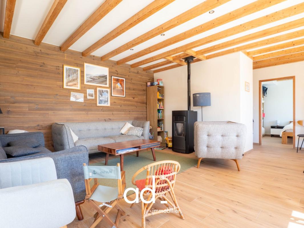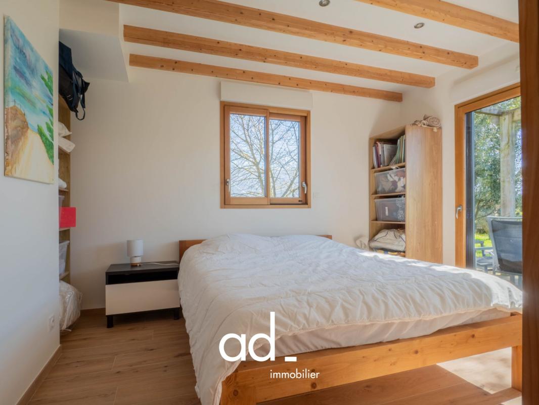 Elle offre au rez-de-chaussée une entrée, une magnifique pièce de vie de 55 m² lumineuse et conviviale comprenant un salon chaleureux avec poêle à bois, un espace salle à manger et de larges ouvertures sur le jardin, ainsi qu’une cuisine ouverte entièrement équipée.Vous y trouverez également une suite parentale avec salle d’eau privative et un WC indépendant.