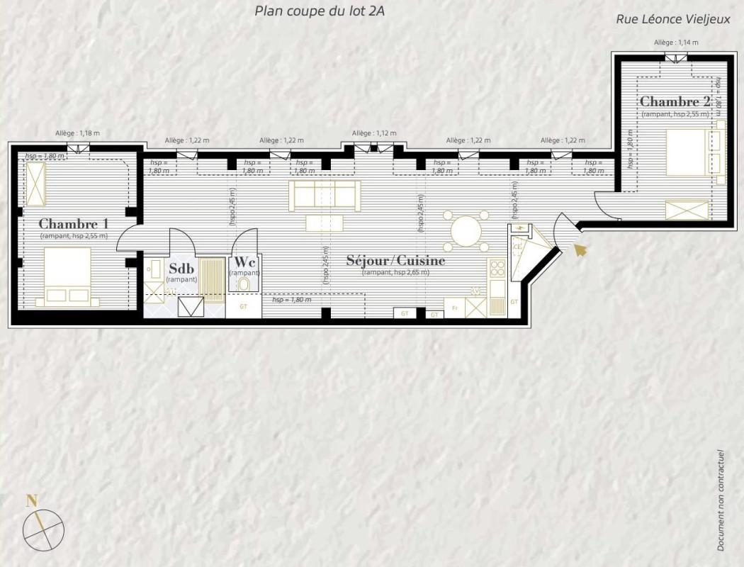 L’entrée s’ouvre sur un espace distinct avec rangements, desservant une première chambre. Vous accédez ensuite à une vaste pièce de vie d’environ 50 m², offrant de beaux volumes et une cuisine ouverte, partiellement équipée. L’appartement dispose également d’une salle d’eau moderne, de WC indépendants ainsi que d’une seconde chambre.